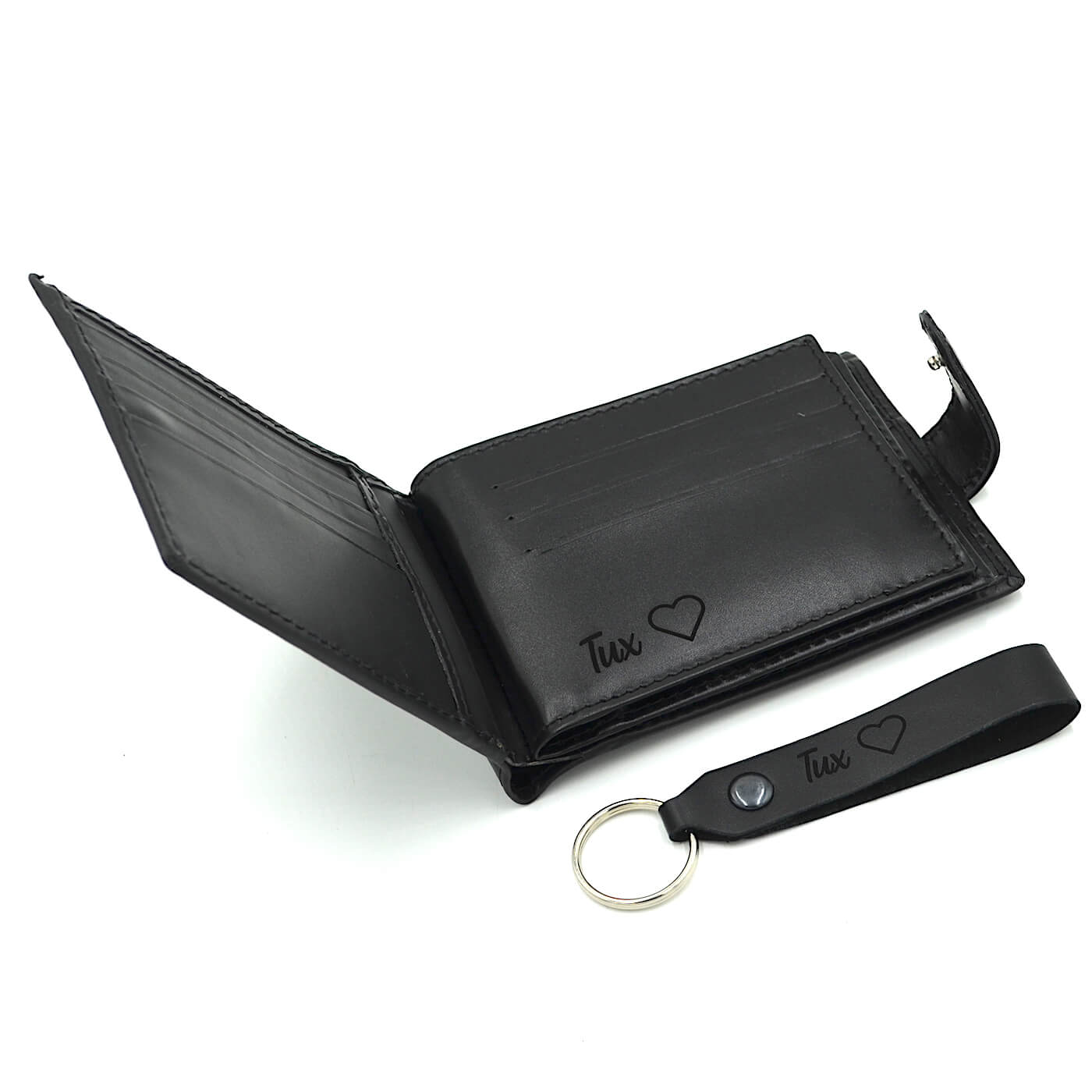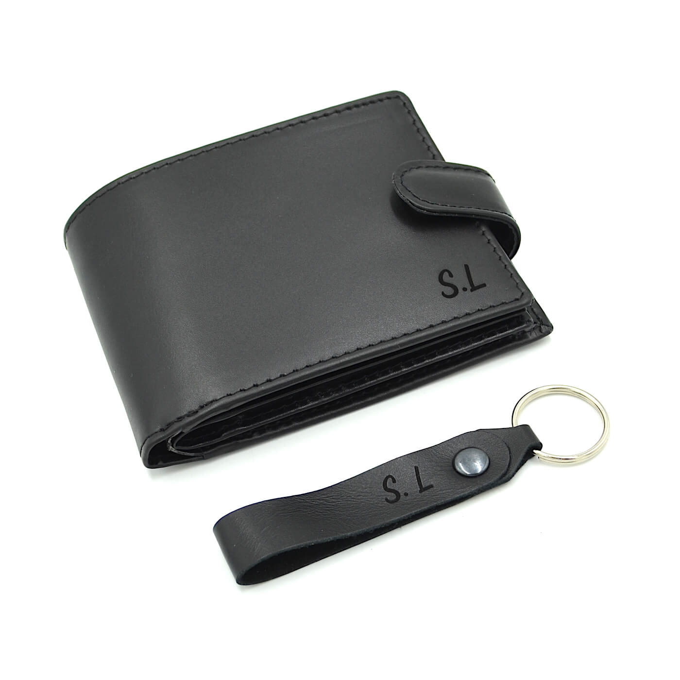 Un cadou practic si elegant pentru barbati, realizat manual in Romania, din piele naturala. Acest set include un portofel personalizat prin gravura laser si un breloc asortat, personalizat, ambele disponibile in culoarea negru, lucios.